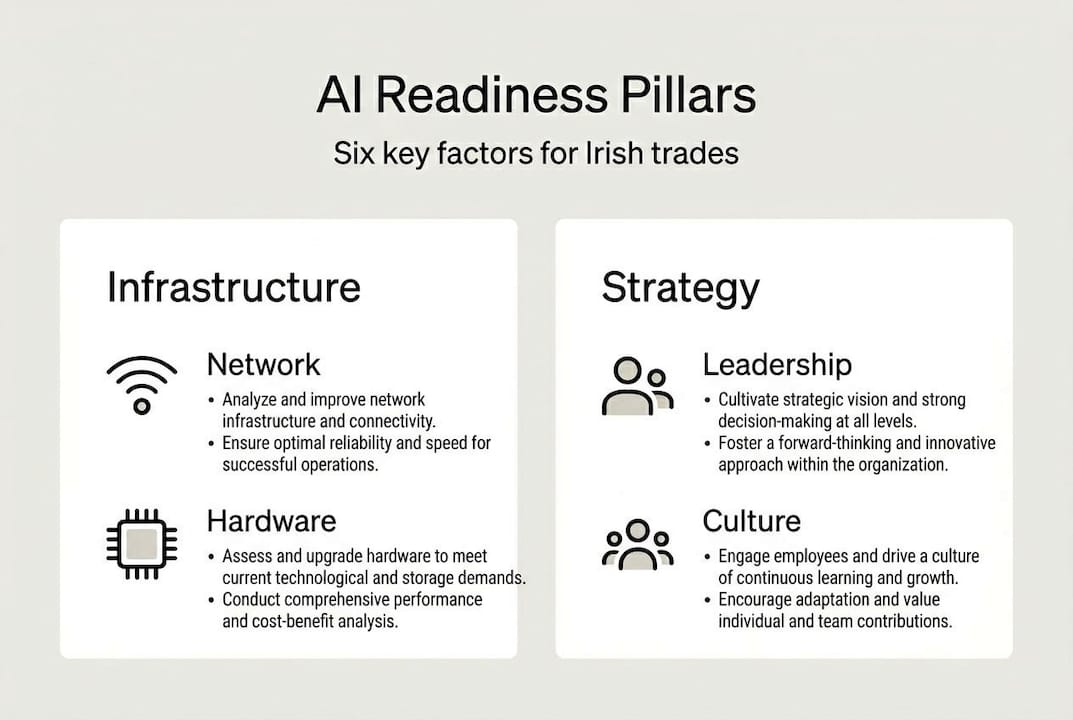 For trades businesses in Ireland, this matters enormously. You might have the budget to invest in AI tools, but if your data is scattered across WhatsApp threads and paper job sheets, or your team has no idea how to use new systems, the investment will stall. As the Cisco AI Readiness Index defines it, AI readiness measures an organisation's preparedness across strategy, infrastructure, data, governance, talent, and culture.